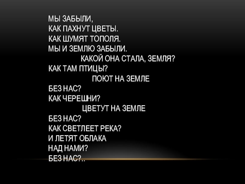 как пахнут цветы. Как шумят тополя. Мы и землю забыли. Какой она стала, земля? Как там птицы? Поют на земле без нас? Как черешни? Цветут на земле без нас? Как светлеет река? И летят облака над нами? Без нас?..