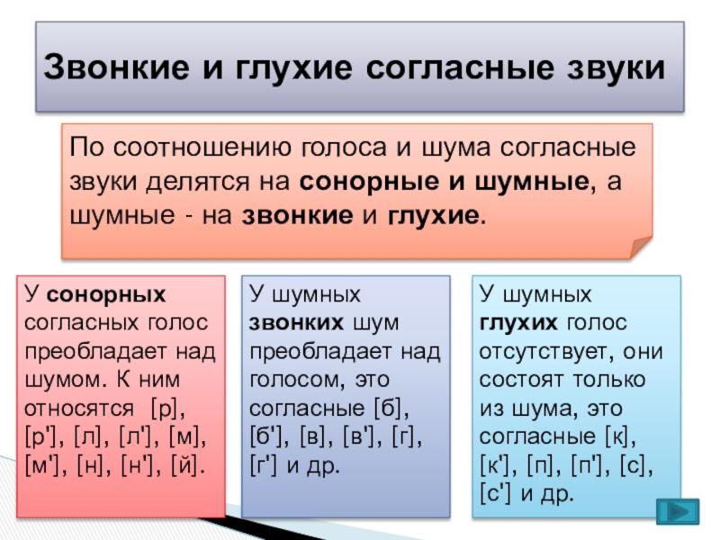 У шумных звонких шум преобладает над голосом, это согласные [б], [б'], [в], [в'], [г], [г'] и др.