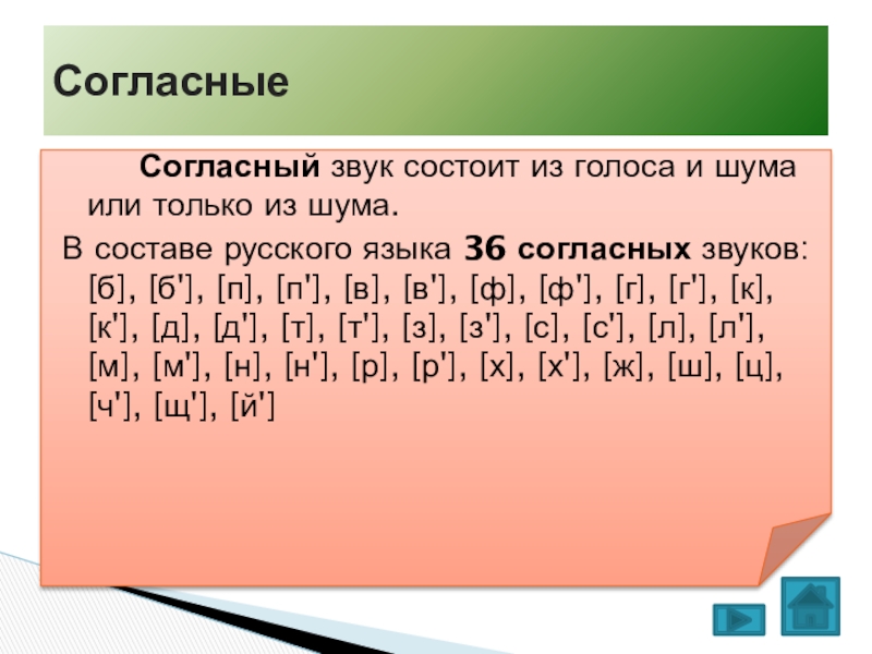 У сонорных согласных голос преобладает над шумом. К ним относятся [р], [р'], [л], [л'], [м], [м'], [н], [н'], [й].