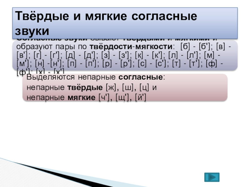 Сонорные согласные также являются непарными (у них нет глухой пары) [р], [р'], [л], [л'], [м], [м'], [н], [н'], [й].