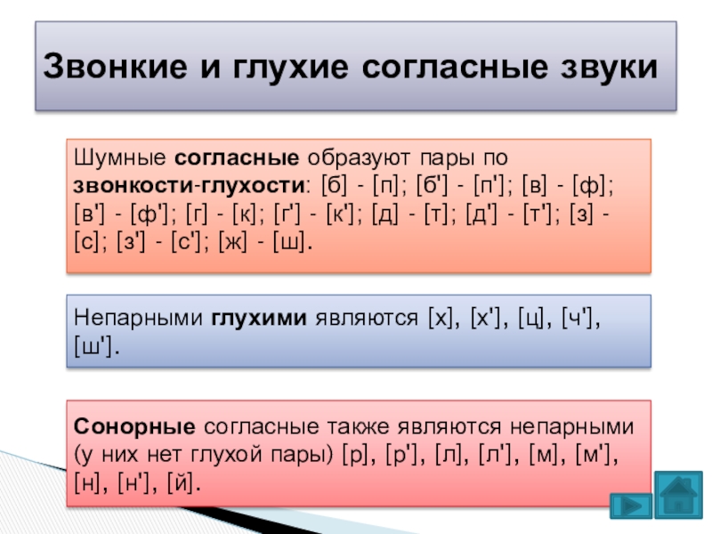 Непарными глухими являются [х], [х'], [ц], [ч'], [ш'].