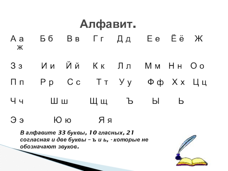 В алфавите 33 буквы, 10 гласных, 21 согласная и две буквы – ъ и ь, - которые не обозначают звуков.