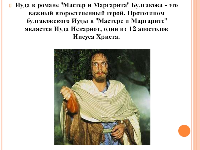 герой. Прототипом булгаковского Иуды в "Мастере и Маргарите" является Иуда Искариот, один из 12 апостолов Иисуса Христа.