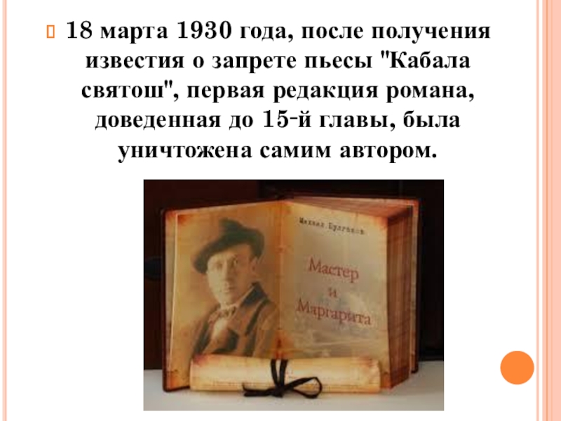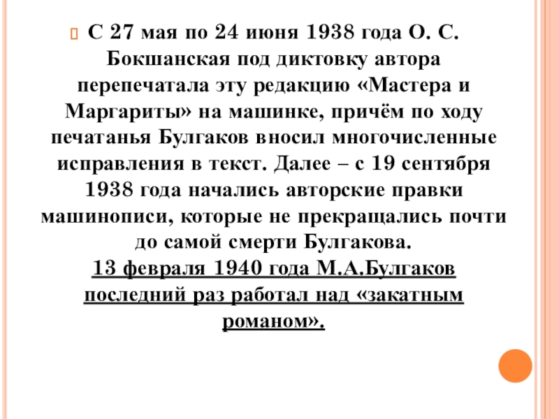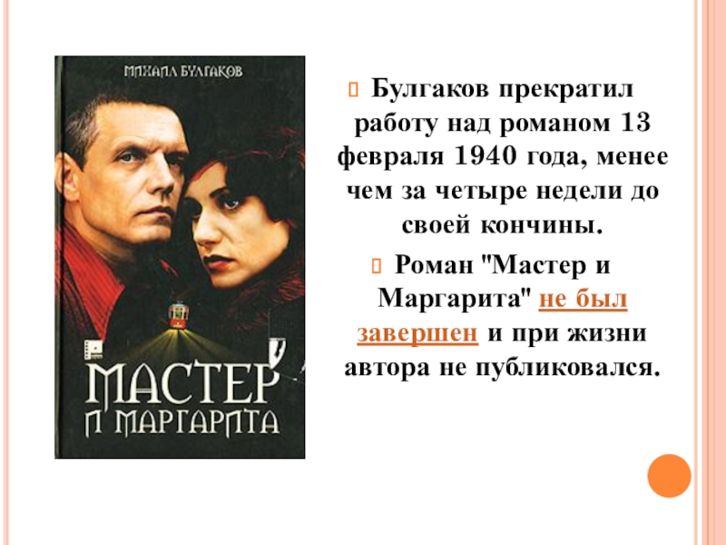 Слайд 17Булгаков прекратил работу над романом 13 февраля 1940 года, менее чем