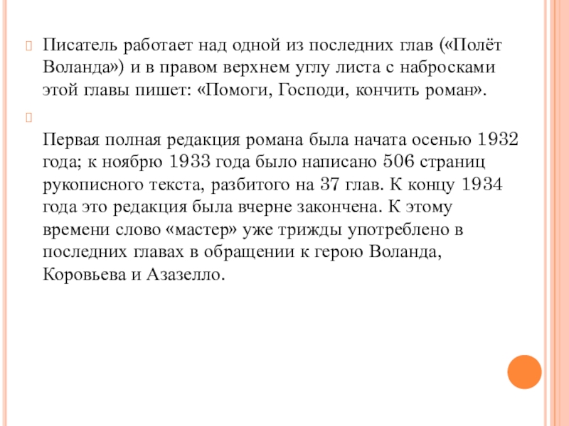Слайд 10Писатель работает над одной из последних глав («Полёт Воланда») и в