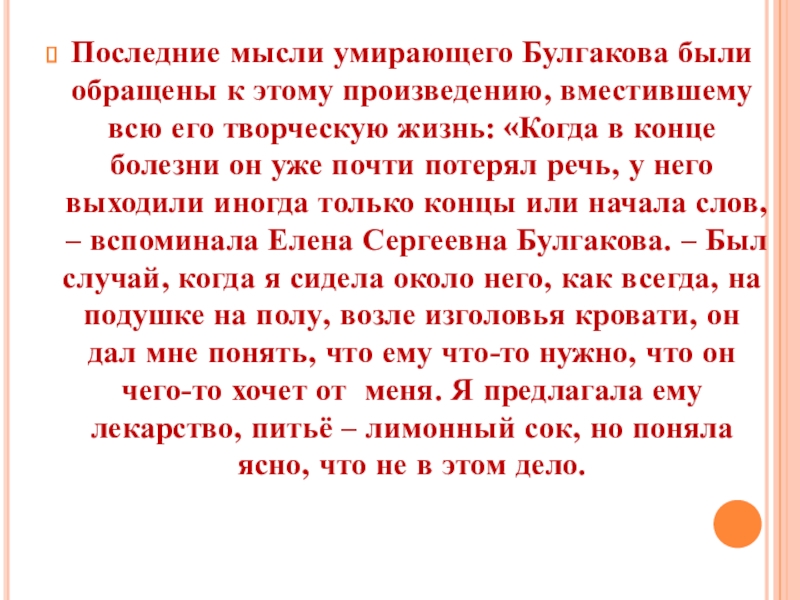 Слайд 14Последние мысли умирающего Булгакова были обращены к этому произведению, вместившему всю