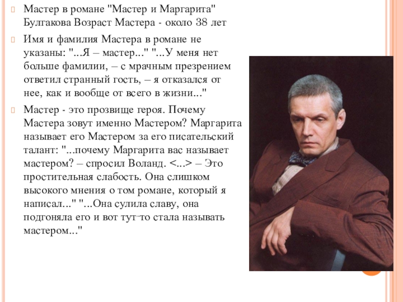 Слайд 21Мастер в романе "Мастер и Маргарита" Булгакова Возраст Мастера - около