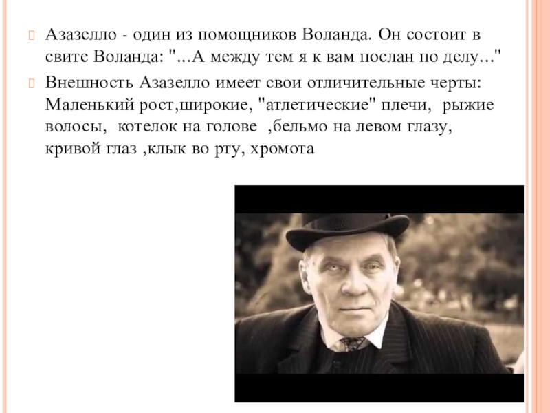Слайд 27Азазелло - один из помощников Воланда. Он состоит в свите Воланда: