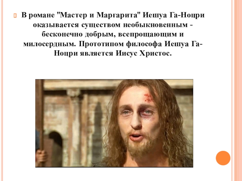 бесконечно добрым, всепрощающим и милосердным. Прототипом философа Иешуа Га-Ноцри является Иисус Христос.