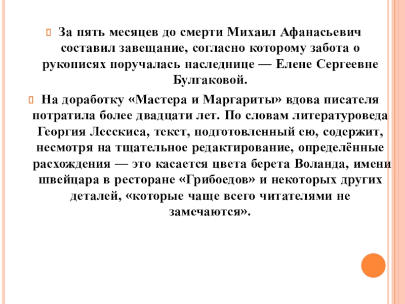 Слайд 16За пять месяцев до смерти Михаил Афанасьевич составил завещание, согласно которому