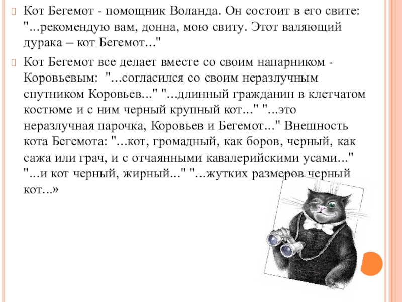 Кот Бегемот все делает вместе со своим напарником - Коровьевым: "...согласился со своим неразлучным спутником Коровьев..." "...длинный гражданин в клетчатом костюме и с ним черный крупный кот..." "...это неразлучная парочка, Коровьев и Бегемот..." Внешность кота Бегемота: "...кот, громадный, как боров, черный, как сажа или грач, и с отчаянными кавалерийскими усами..." "...и кот черный, жирный..." "...жутких размеров черный кот...»