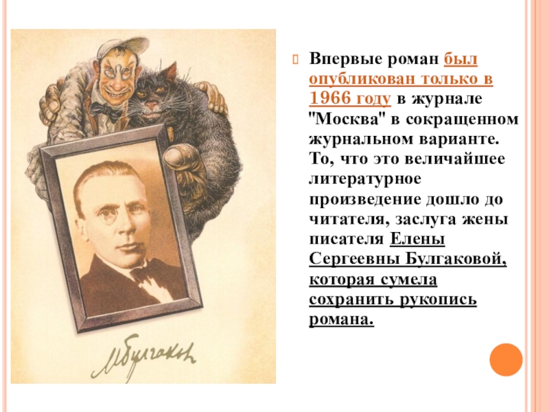 журнальном варианте. То, что это величайшее литературное произведение дошло до читателя, заслуга жены писателя Елены Сергеевны Булгаковой, которая сумела сохранить рукопись романа.