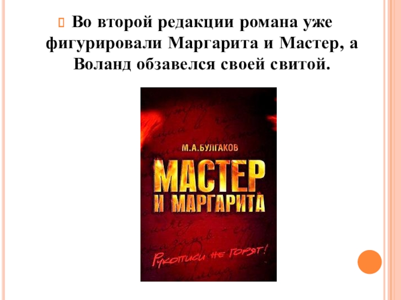 Слайд 11Во второй редакции романа уже фигурировали Маргарита и Мастер, а Воланд