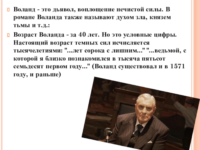 Слайд 24Воланд - это дьявол, воплощение нечистой силы. В романе Воланда также