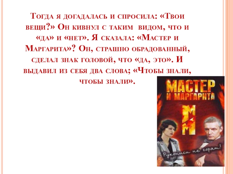 видом, что и «да» и «нет». Я сказала: «Мастер и Маргарита»? Он, страшно обрадованный, сделал знак головой, что «да, это». И выдавил из себя два слова; «Чтобы знали, чтобы знали».