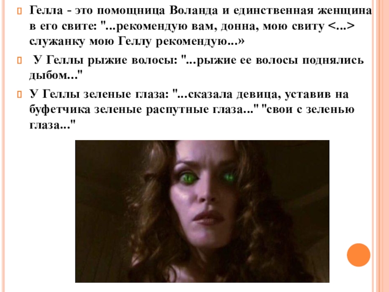 Слайд 28Гелла - это помощница Воланда и единственная женщина в его свите: