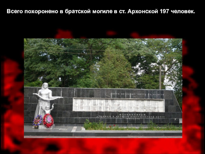 Слайд 9Всего похоронено в братской могиле в ст. Архонской 197 человек.