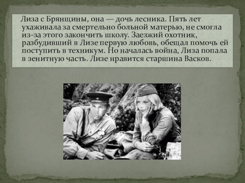 ухаживала за смертельно больной матерью, не смогла из-за этого закончить школу. Заезжий охотник, разбудивший в Лизе первую любовь, обещал помочь ей поступить в техникум. Но началась война, Лиза попала в зенитную часть. Лизе нравится старшина Васков.