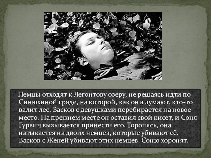 Синюхиной гряде, на которой, как они думают, кто-то валит лес. Васков с девушками перебирается на новое место. На прежнем месте он оставил свой кисет, и Соня Гурвич вызывается принести его. Торопясь, она натыкается на двоих немцев, которые убивают её. Васков с Женей убивают этих немцев. Соню хоронят.