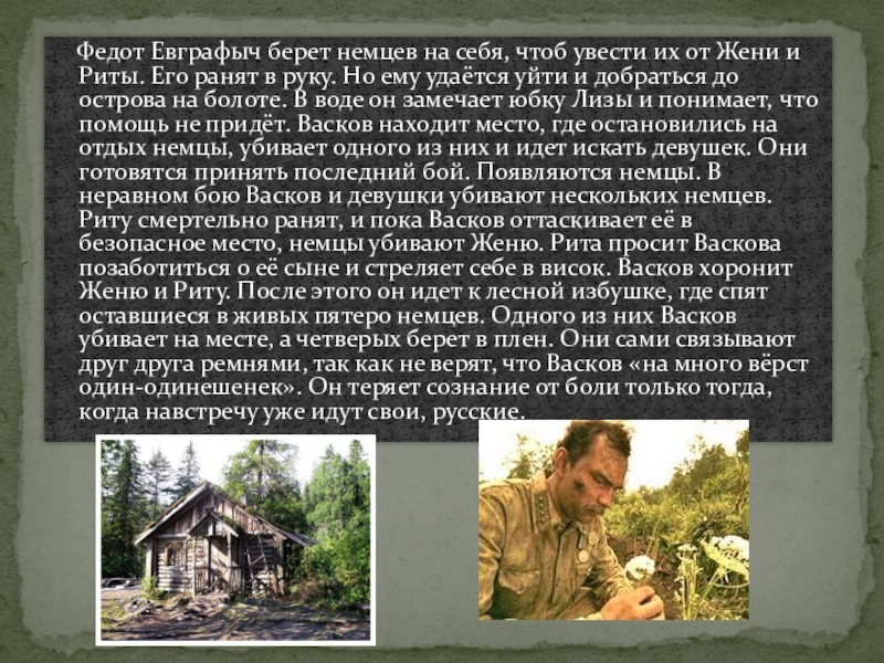 от Жени и Риты. Его ранят в руку. Но ему удаётся уйти и добраться до острова на болоте. В воде он замечает юбку Лизы и понимает, что помощь не придёт. Васков находит место, где остановились на отдых немцы, убивает одного из них и идет искать девушек. Они готовятся принять последний бой. Появляются немцы. В неравном бою Васков и девушки убивают нескольких немцев. Риту смертельно ранят, и пока Васков оттаскивает её в безопасное место, немцы убивают Женю. Рита просит Васкова позаботиться о её сыне и стреляет себе в висок. Васков хоронит Женю и Риту. После этого он идет к лесной избушке, где спят оставшиеся в живых пятеро немцев. Одного из них Васков убивает на месте, а четверых берет в плен. Они сами связывают друг друга ремнями, так как не верят, что Васков «на много вёрст один-одинешенек». Он теряет сознание от боли только тогда, когда навстречу уже идут свои, русские.