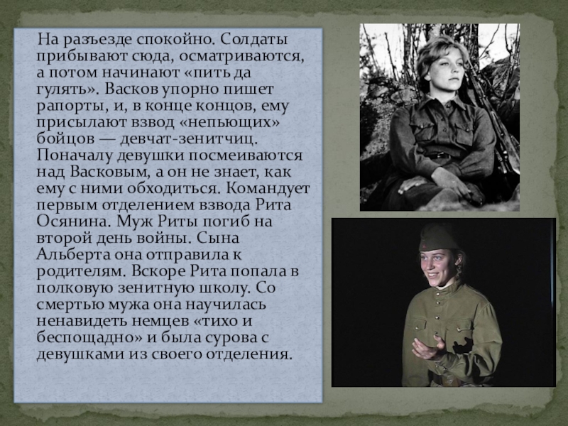 начинают «пить да гулять». Васков упорно пишет рапорты, и, в конце концов, ему присылают взвод «непьющих» бойцов — девчат-зенитчиц. Поначалу девушки посмеиваются над Васковым, а он не знает, как ему с ними обходиться. Командует первым отделением взвода Рита Осянина. Муж Риты погиб на второй день войны. Сына Альберта она отправила к родителям. Вскоре Рита попала в полковую зенитную школу. Со смертью мужа она научилась ненавидеть немцев «тихо и беспощадно» и была сурова с девушками из своего отделения.