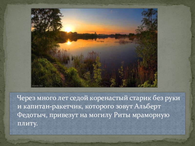 Слайд 13 Через много лет седой коренастый старик без руки и