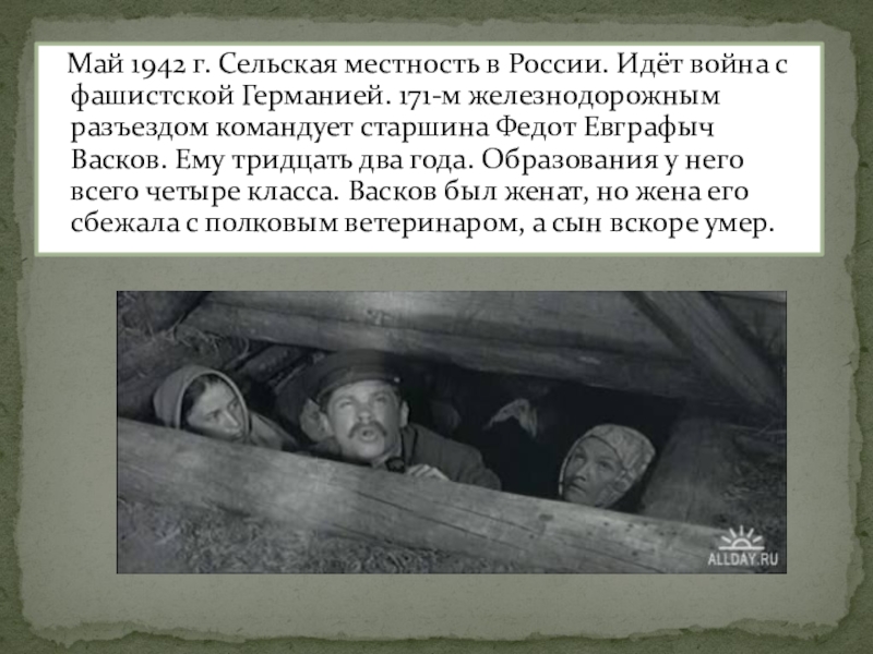 с фашистской Германией. 171-м железнодорожным разъездом командует старшина Федот Евграфыч Васков. Ему тридцать два года. Образования у него всего четыре класса. Васков был женат, но жена его сбежала с полковым ветеринаром, а сын вскоре умер.