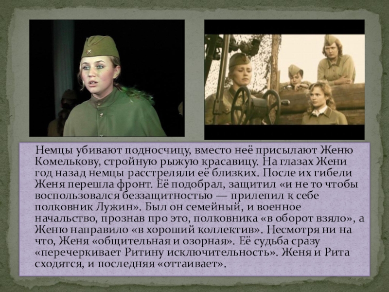 Слайд 4 Немцы убивают подносчицу, вместо неё присылают Женю Комелькову, стройную
