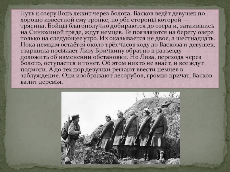 девушек по хорошо известной ему тропке, по обе стороны которой — трясина. Бойцы благополучно добираются до озера и, затаившись на Синюхиной гряде, ждут немцев. Те появляются на берегу озера только на следующее утро. Их оказывается не двое, а шестнадцать. Пока немцам остаётся около трёх часов ходу до Васкова и девушек, старшина посылает Лизу Бричкину обратно к разъезду — доложить об изменении обстановки. Но Лиза, переходя через болото, оступается и тонет. Об этом никто не знает, и все ждут подмоги. А до тех пор девушки решают ввести немцев в заблуждение. Они изображают лесорубов, громко кричат, Васков валит деревья.