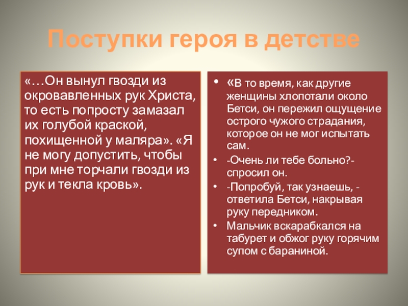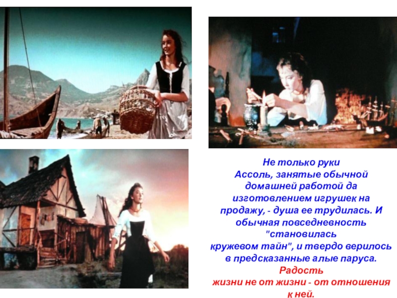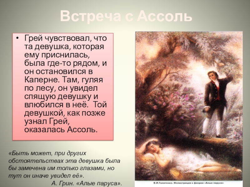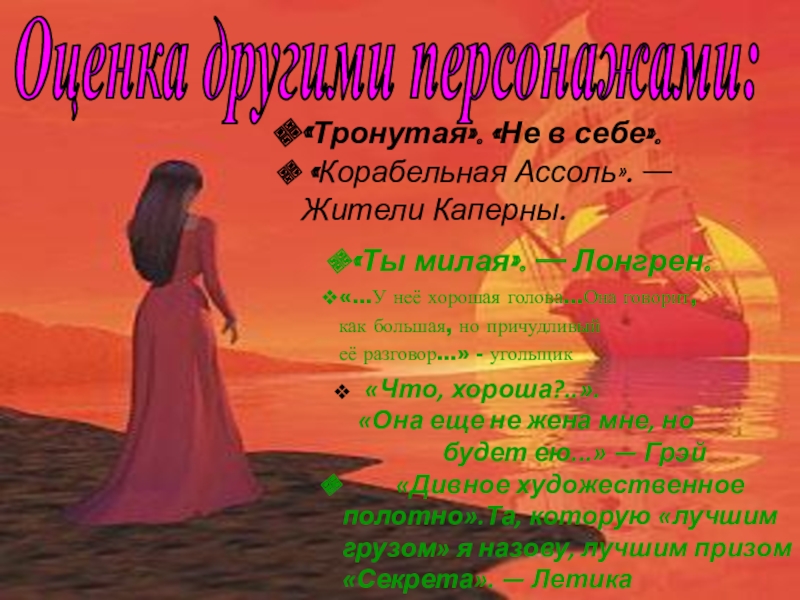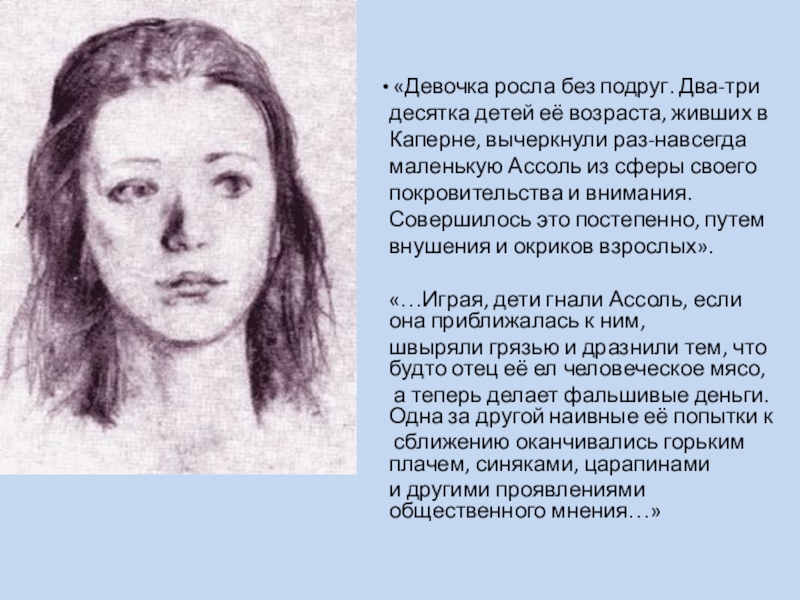 «Девочка росла без подруг. Два-три десятка детей её возраста, живших в Каперне, вычеркнули раз-навсегда маленькую Ассоль из сферы своего покровительства и внимания. Совершилось это постепенно, путем внушения и окриков взрослых».