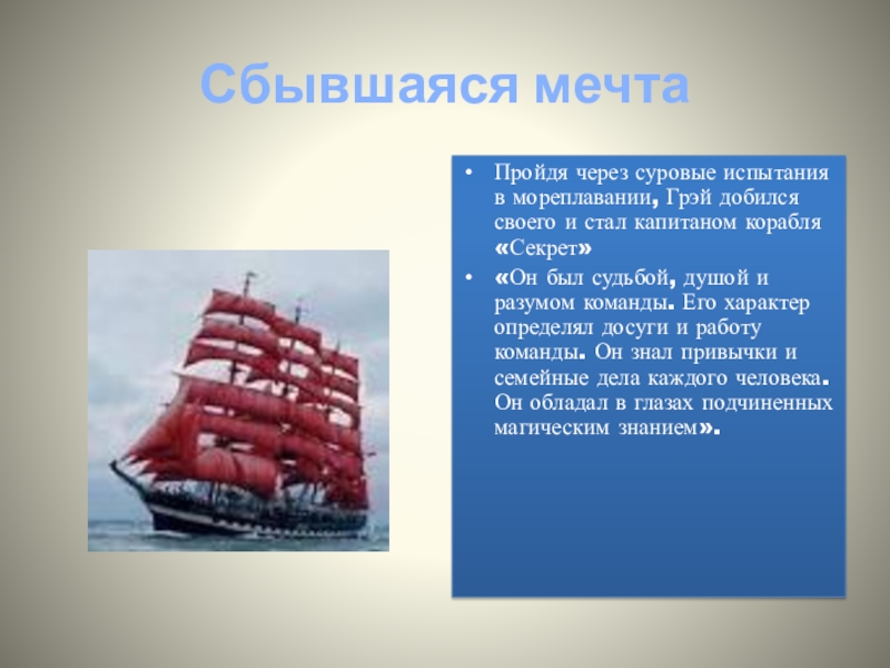 Это событие стало самым важным из всех, что с ним случались. Благодаря этой картине, у Грэя появилась мечта стать капитаном корабля.