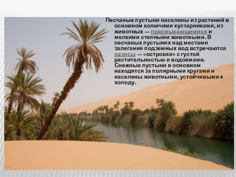 пресмыкающимися и мелкими степными животными. В песчаных пустынях над местами залегания подземных вод встречаются оазисы — «островки» с густой растительностью и водоёмами. Снежные пустыни в основном находятся за полярными кругами и населены животными, устойчивыми к холоду.