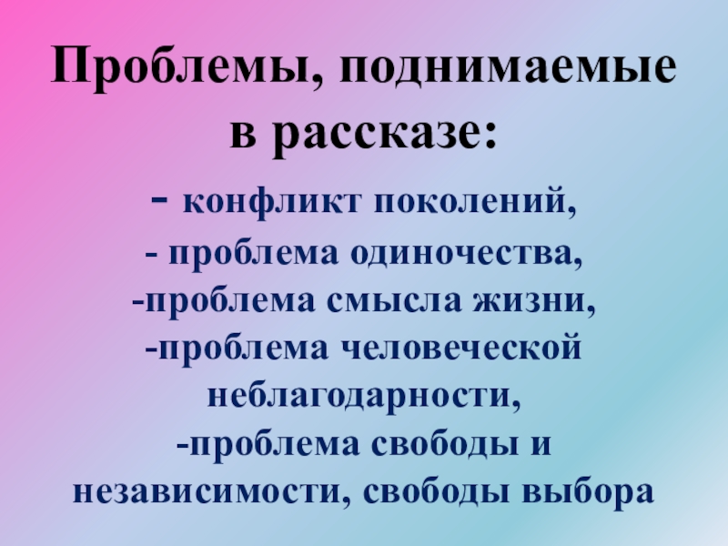 Проблемы, поднимаемые в рассказе: - конфликт поколений,  - проблема одиночества,  -проблема смысла жизни,  -проблема