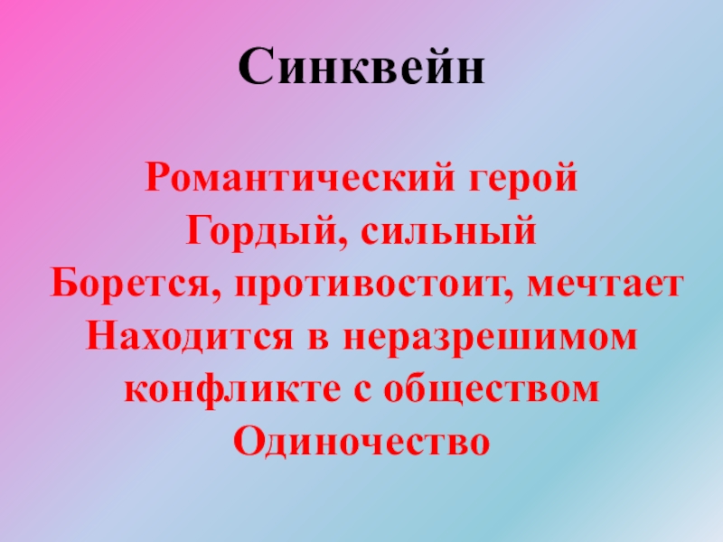 Синквейн  Романтический герой Гордый, сильный Борется, противостоит, мечтает Находится в неразрешимом конфликте с обществом Одиночество