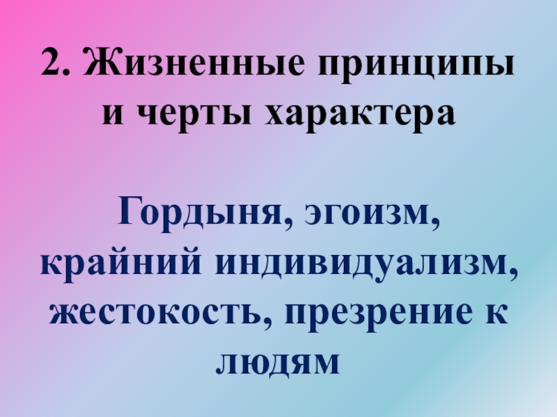 2. Жизненные принципы и черты характера  Гордыня, эгоизм, крайний индивидуализм, жестокость, презрение к людям