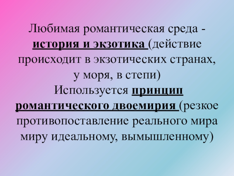 странах, у моря, в степи) Используется принцип романтического двоемирия (резкое противопоставление реального мира миру идеальному, вымышленному)