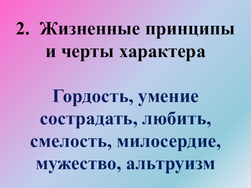 Слайд 34 2. Жизненные принципы и черты характера Гордость, умение сострадать, любить, смелость,