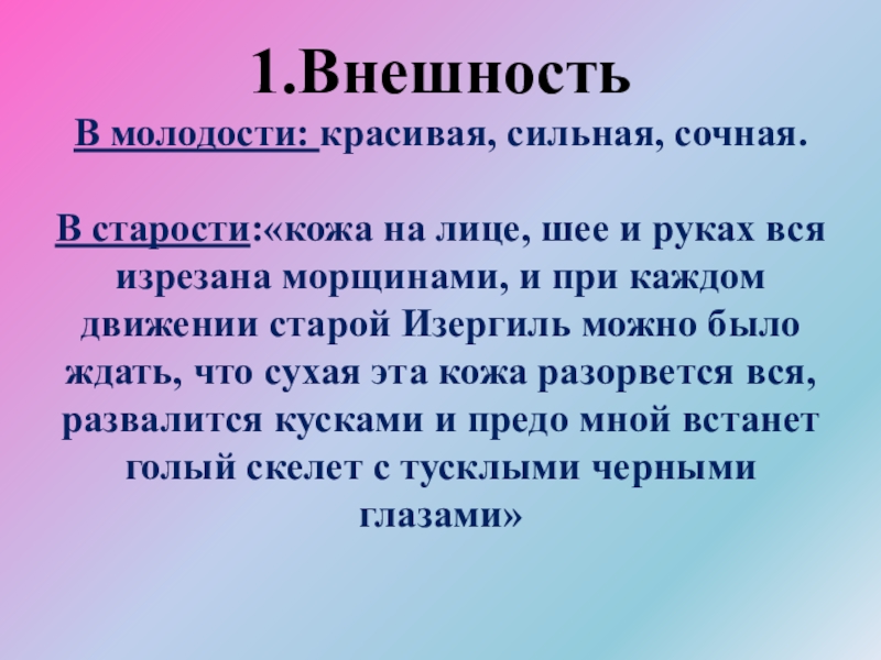 Слайд 431.Внешность В молодости: красивая, сильная, сочная. В старости:«кожа на лице, шее и руках