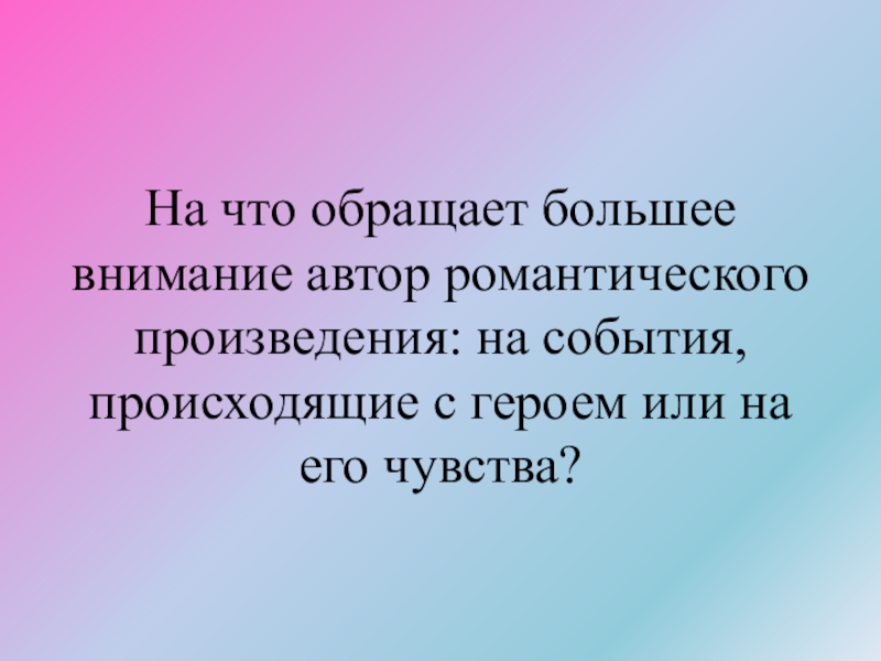 Слайд 10На что обращает большее внимание автор романтического произведения: на события, происходящие