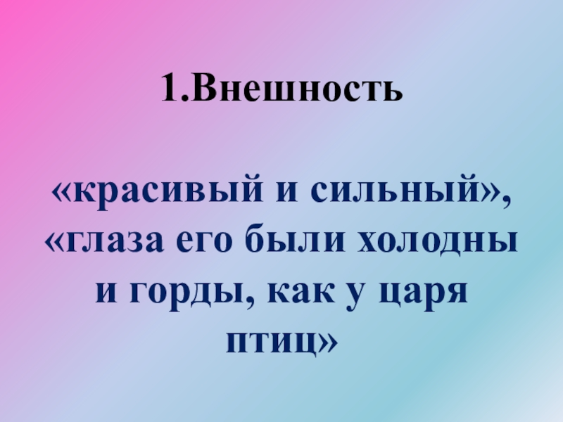 Слайд 211.Внешность «красивый и сильный», «глаза его были холодны и горды, как у