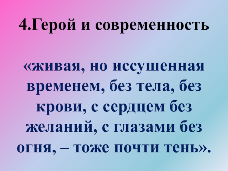 4.Герой и современность  «живая, но иссушенная временем, без тела, без крови, с сердцем без желаний, с