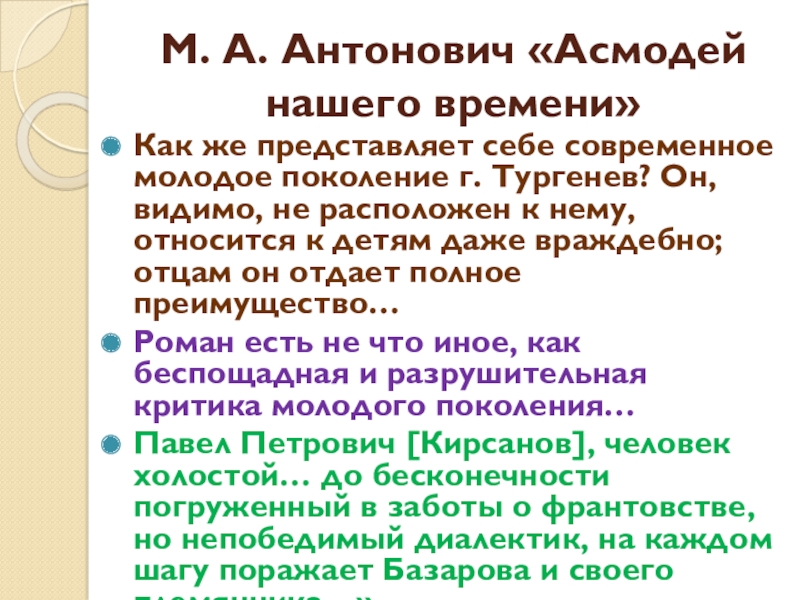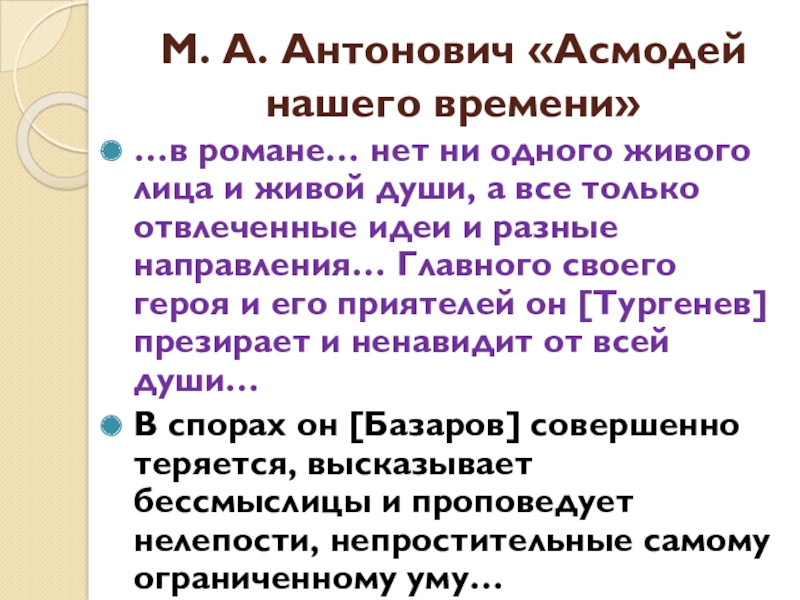 В статье «Асмодей нашего времени» Антонович отрицательно отозвался о романе И. С. Тургенева «Отцы и дети». Критик увидел в романе идеализацию отцов и клевету на детей. В Базарове Антонович находил безнравственность и «кашу» в голове. Евгений Базаров – карикатура, клевета на молодое поколение.