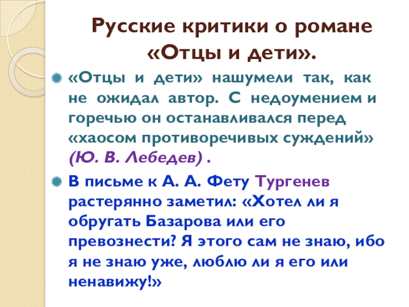 В письме к А. А. Фету Тургенев растерянно заметил: «Хотел ли я обругать Базарова или его превознести? Я этого сам не знаю, ибо я не знаю уже, люблю ли я его или ненавижу!»
