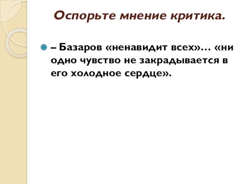 – Базаров «ненавидит всех»… «ни одно чувство не закрадывается