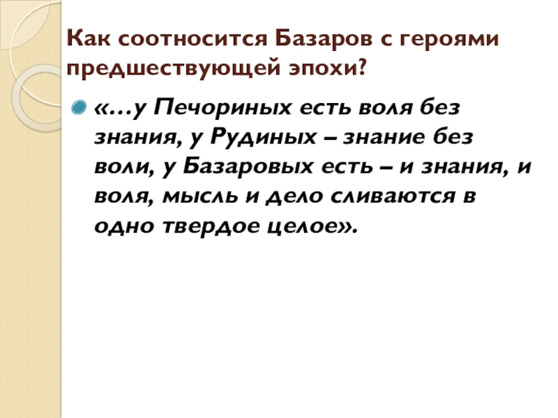 знания, у Рудиных – знание без воли, у Базаровых есть – и знания, и воля, мысль и дело сливаются в одно твердое целое».