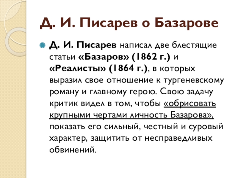 «Базаров» (1862 г.) и «Реалисты» (1864 г.), в которых выразил свое отношение к тургеневскому роману и главному герою. Свою задачу критик видел в том, чтобы «обрисовать крупными чертами личность Базарова», показать его сильный, честный и суровый характер, защитить от несправедливых обвинений.