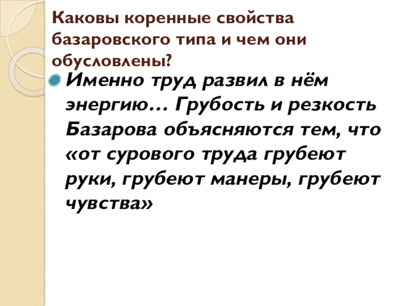 Слайд 8Каковы коренные свойства базаровского типа и чем они обусловлены?
