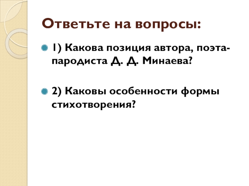1) Какова позиция автора, поэта-пародиста Д. Д. Минаева?