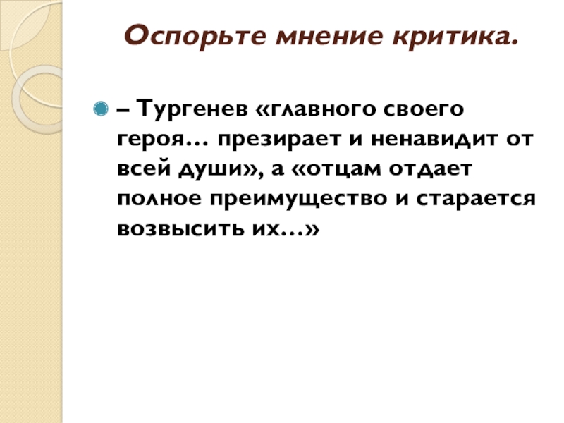 – Тургенев «главного своего героя… презирает и ненавидит от