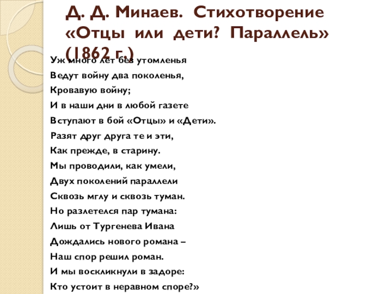 Слайд 16Д. Д. Минаев. Стихотворение «Отцы или дети? Параллель» (1862 г.)